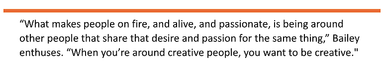 “What makes people on fire, and alive, and passionate, is being around other people that share that desire and intensity for the same thing,” Bailey enthuses. “When you’re around creative people in class or on sets, you want to be creative. The in-person team experience lights a fire in you.”